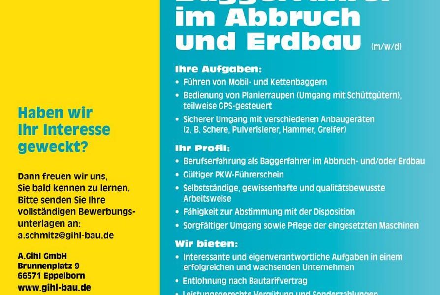 • Berufserfahrung als Baggerfahrer im Abbruch- und/oder Erdbau
